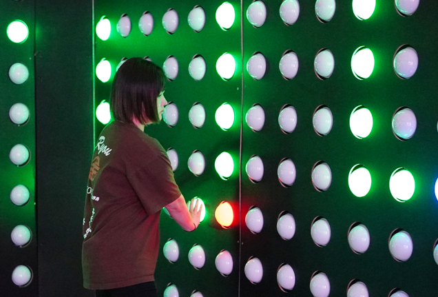 Scale the interactive wall using green grips, dodge the reds, and hit the blues as they light up.